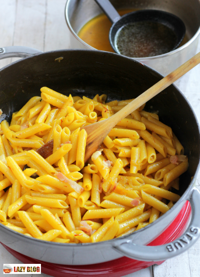 En este caso, dado el volumen de la pasta nos interesa usar una cazuela ancha para que el caldo pueda cubrir los macarrones aunque lo añadamos poco a poco, sin añadir más caldo hasta que se haya absorbido el cazo anterior.