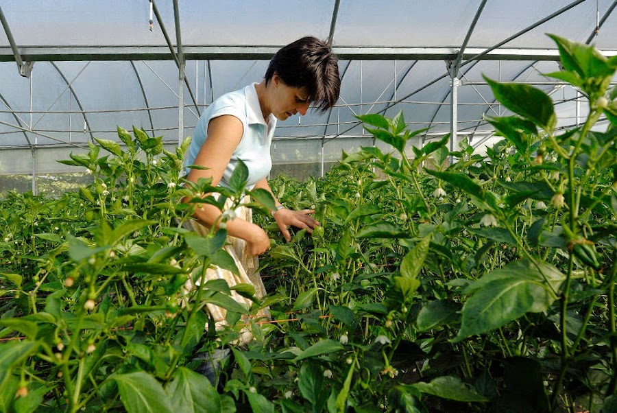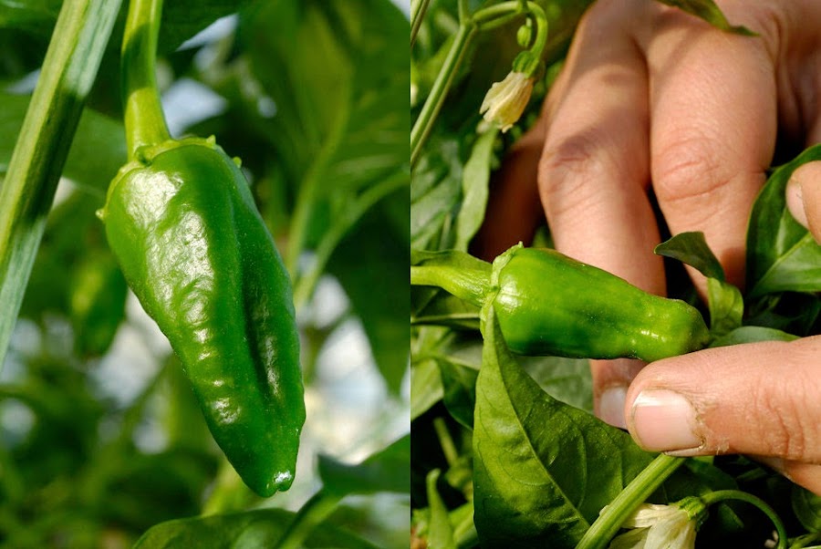 Las recolectoras van ataviadas con un mandil que se ata a la cintura y forma la bolsa donde depositarán los pimientos. Se recogen desde primeras horas del día hasta el final del mediodía. Es un trabajo que exige agudizar los sentidos, en especial la vista y el tacto: se eligen los ejemplares más lustrosos y aptos, que miden cerca de cinco centímetros y son compactos, nunca los que crujen o huelen mucho a picante.