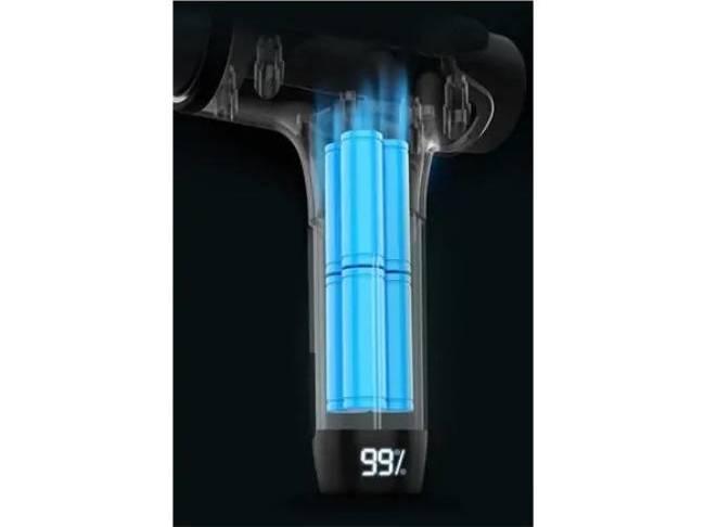 Lo primero que vemos ahora en esta nueva pistola de masaje y vibración es que la batería está integrada en el propio dispositivo para que no se pueda manipular y que sea siempre el propio fabricante quien nos la cambie cuando llegue el fin de su vida útil, del mismo modo que pasa con los smartphones actuales. Dicha batería nos indica con unos números LEDS la carga real que le queda, para que en todo momento seamos conscientes del tiempo de uso que podemos seguir utilizándola antes de volver a cargar.