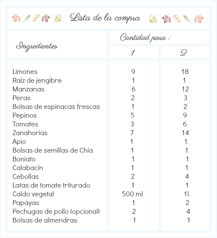 Además, para que os sea más fácil y rápido de hacer, a bajo del todo encontraréis la lista de la compra para hacerlo con cantidades para una o dos personas, y aquí os dejo el menú para la semana que viene.