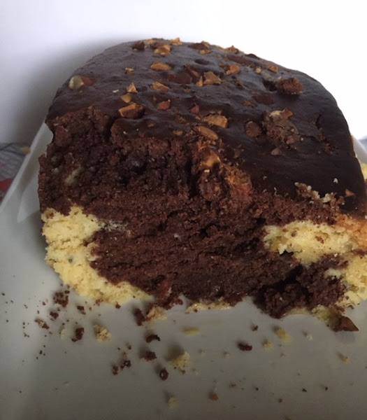 Empezamos precalentando el horno a 180 grados, fundimos el chocolate al baño de maría o al microondas en trozos por 2 minutos y reservamos. En un bol cernimos la harina con la sal y el polvo de hornear, reservamos. Mezclamos la mantequilla con el azúcar a alta velocidad 3-4 minutos hasta obtener una mezcla suave y esponjosa, bajamos la velocidad y añadimos los huevos uno a uno hasta que estén bien incorporados, en este punto alternamos la harina y el yogur, empezando y terminando con la harina, y no batir en exceso para que no quede duro. Dividimos la mezcla en partes iguales, y a uno le añadimos el chocolate; luego pasamos las mezclas a un molde (yo utilizo de silicona, sino engrasar y espolvorear con harina para que no se pegue la masa) primero puse la blanca y luego la de chocolate y espolvoree por encima las nueces y al horno por aproximadamente 40/50 minutos o hasta que con un palillo o cuchillo salga limpio, dejamos enfriar, y a disfrutar,