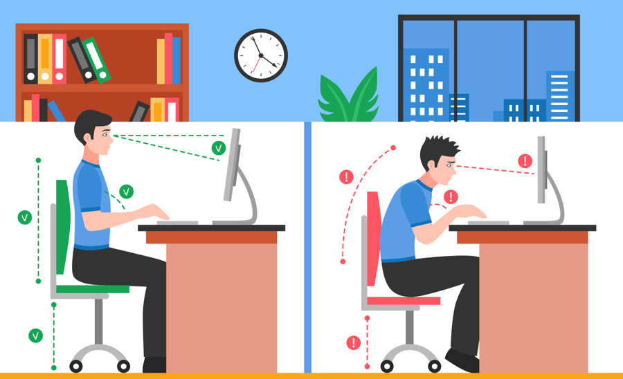 Asimismo, debes ser consciente de tu 'higiene postural', es decir, debes intentar adoptar siempre una posición correcta y equilibrada en la medida de lo posible: flexión de las rodillas, espalda recta y trasero hacia atrás. Y si trabajas frente a la pantalla de un ordenador, trata de seguir las indicaciones que se reflejan en la siguiente imagen.