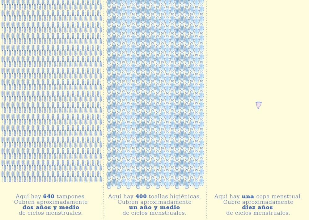 Cada vez soy más consciente de la cantidad de residuos que generamos nosotros mismos y que con pequeños gestos podemos cambiar. Uno de ellos sin duda es con la copa menstrual. Cada mujer va a usar durante su vida un promedio de 7.000 a 11.000 tampones o compresas y toda esta gran cantidad de basura se puede reducir en una copa. Esta imagen del blog de Cualquier cosita es cariño lo ilustra perfectamente.
