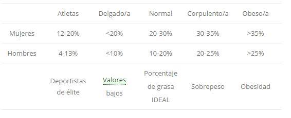 El American College of Sports Medicine (Colegio americano de medicina del deporte) sugiere que el porcentaje de grasa corporal óptima promedio en mujer de 18 a 26 % y en hombres de 15 a 20%; que son los rangos que manejan normalmente en consulta, teniendo un límite inferior para hombres del 5% y 10% en mujeres.