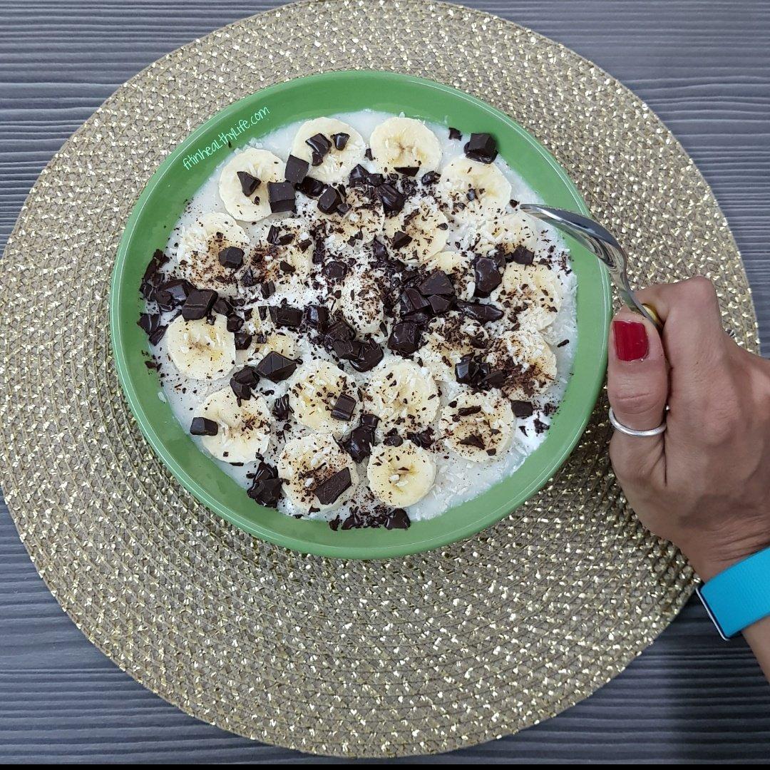 PORRIDGE DE CHOCO BLANCO Y COCO CON COTTAGE, PLÁTANO Y CHOCOLATE