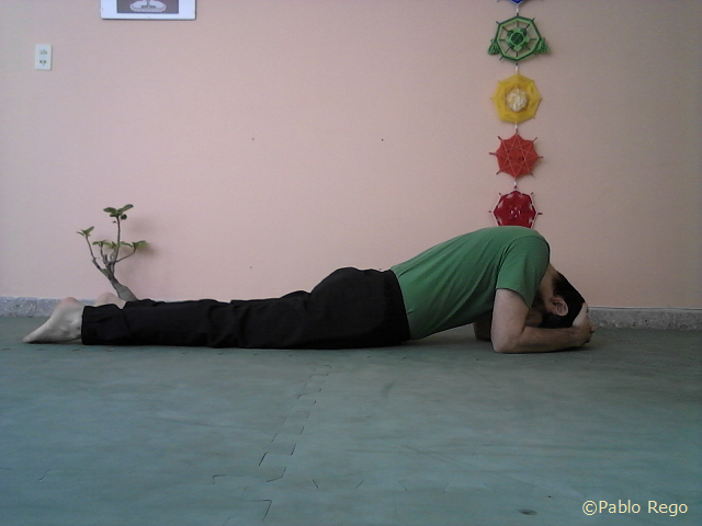 La postura de “El Caracol” se realiza boca abajo, apoyando los codos en el suelo en línea con los hombros, elevando así la parte alta del cuerpo, mientras las caderas y piernas, y eventualmente el abdomen, permanecen completamente apoyadas en el suelo. Sin mover la posición de los codos del suelo, apoyados justo debajo de los hombros, entrelazaremos los dedos de las manos e intentaremos llevar la zona alta de la cabeza hacia el suelo, extendiendo el cuello para poder sostener así la nuca con las manos que permanecen con sus dedos entrelazados. Una vez armada la postura soltaremos la tensión de todo el cuerpo menos de las partes que sostienen la postura, como los brazos y las manos, provocando así una extensión de la zona cervical sin hacer ningún esfuerzo.