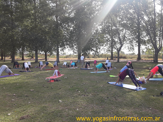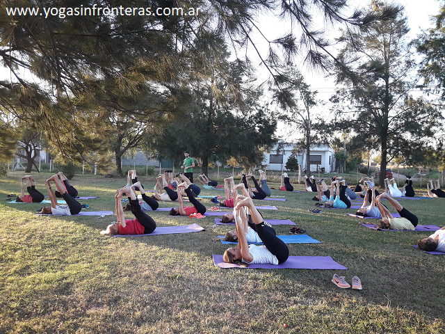 Práctica de la postura de "La Carpa" en una clase de Yoga al aire libre en Vedia, Pcia. de Buenos Aires, Argentina.