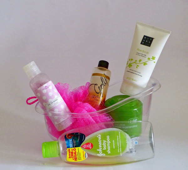 Yo en estos baños me suelo exfoliar tanto el cuerpo como la cara. Ambos productos que he utilizado (amie y rituals) tienen el gránulo finito, ideal para exfoliar sin agredir. Tanto para exfoliarme el cuerpo, como para lavarme con el gel, utilizo esa esponja que veis que me encanta porque rasca poco, limpia y ayuda a ahorrar producto.