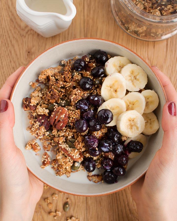 Para acompañar al muesli, os recomiendo leche de coco, unas rodajas de plátano y unos arándanos. También podéis tomarlo con yogurt, o llevároslo al trabajo como snack. Todas las recetas de muesli del blog están listas en unos 20′. Estoy segura de que te vas a enganchar después de probar este bol de Muesli Crujiente de Quinoa y pecanas.