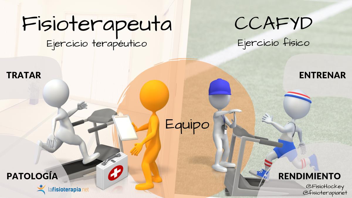¿Quiere decir esto que los CCAFYDs no tienen por qué saber de lesiones? Por supuesto que tienen que saber de lesiones, porque ambos tenemos competencia sobre los pacientes lesionados mediante el ejercicio: el fisioterapeuta trata lesionados y el CCAFYD entrena lesionados. Y esto no es como entrenar a aquellos que no lo estén. Para distinguir estos dos objetivos se han acuñado los términos “Ejercicio Físico” y “Ejercicio Terapéutico” respectivamente: