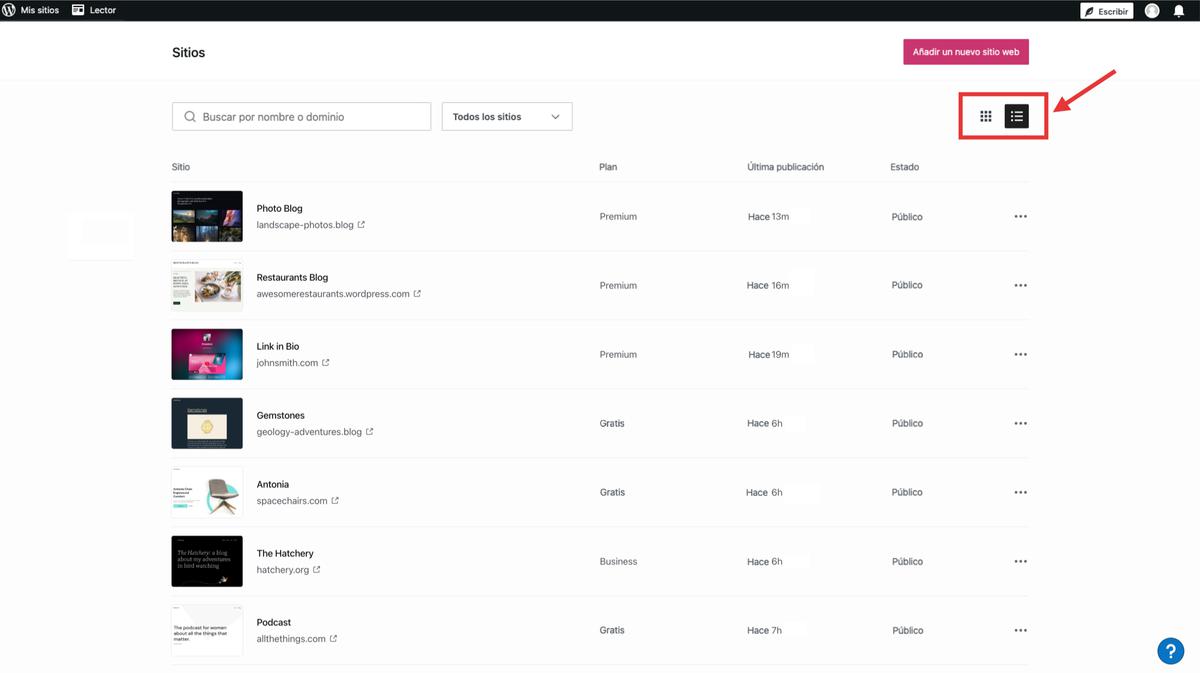 Puedes acceder a esta nueva página de Sitios en wordpress.com/sites.