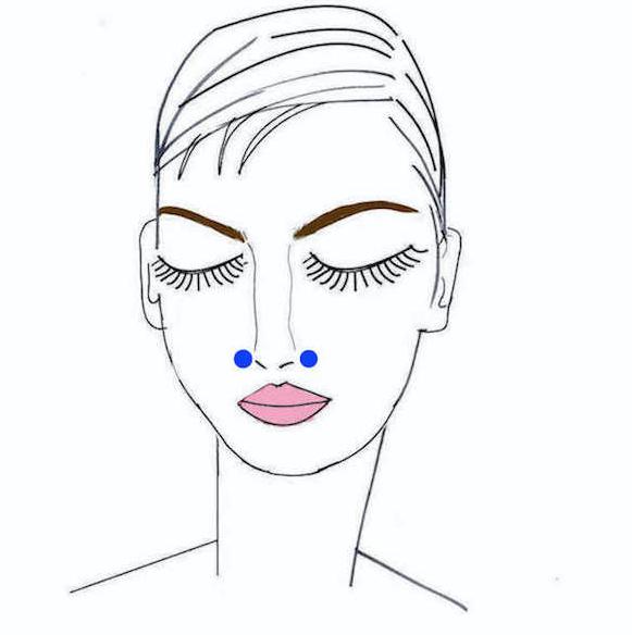 Este punto pasa por el canal energético del intestino grueso y se ubica a ambos lados de las fosas nasales. Encuéntralos palpando el hueso del pómulo. Justo cuando encuentres los hoyuelos, mueve tus dedos hacia la nariz. Este punto está justo a los lados de las fosas nasales.