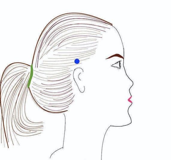 Se encuentra en la zona de la sien, un poco más arriba de las orejas.