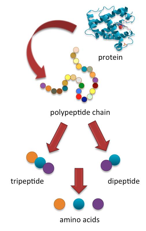 El proceso va así: tu cuerpo desmenuza las proteínas a cadenas de polipéptidos, después a péptidos, y al último en aminoácidos, que son los bloques básicos para construir de nuevo estas estructuras grandes (proteínas) que componen tus tejidos: