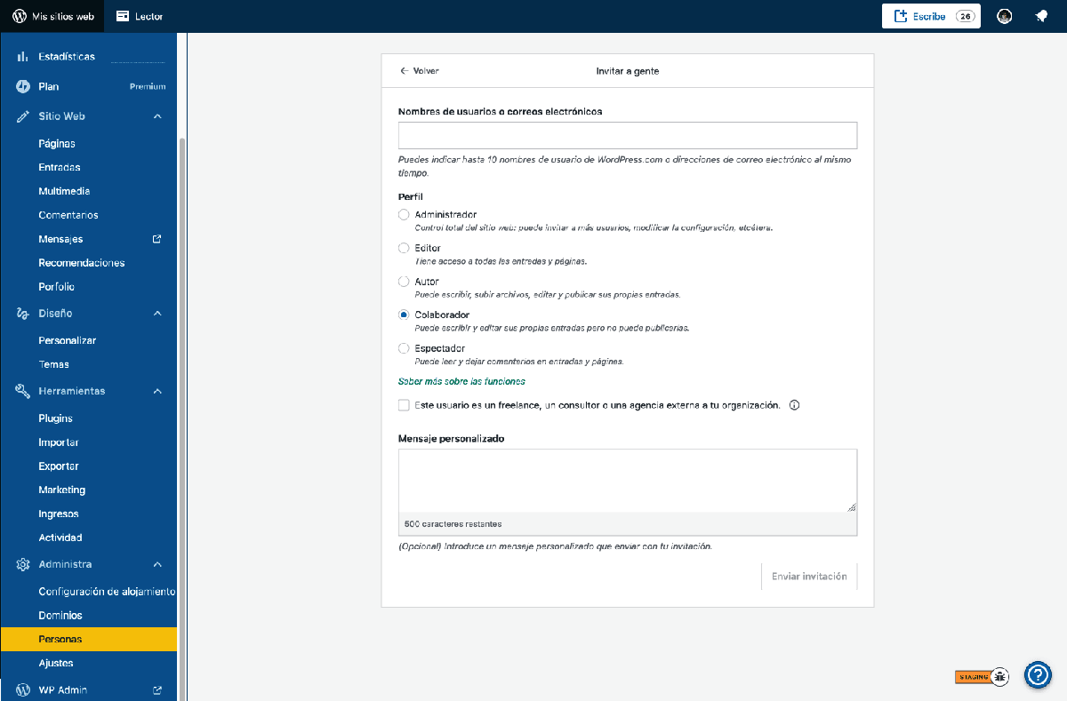 Para invitar a otras personas a ver tu sitio en el modo Próximamente, añádelas como nuevos usuarios desde Administra → Personas → Invita. Los usuarios necesitarán ser invitados al menos como Colaboradores para poder ver tu sitio en este modo.