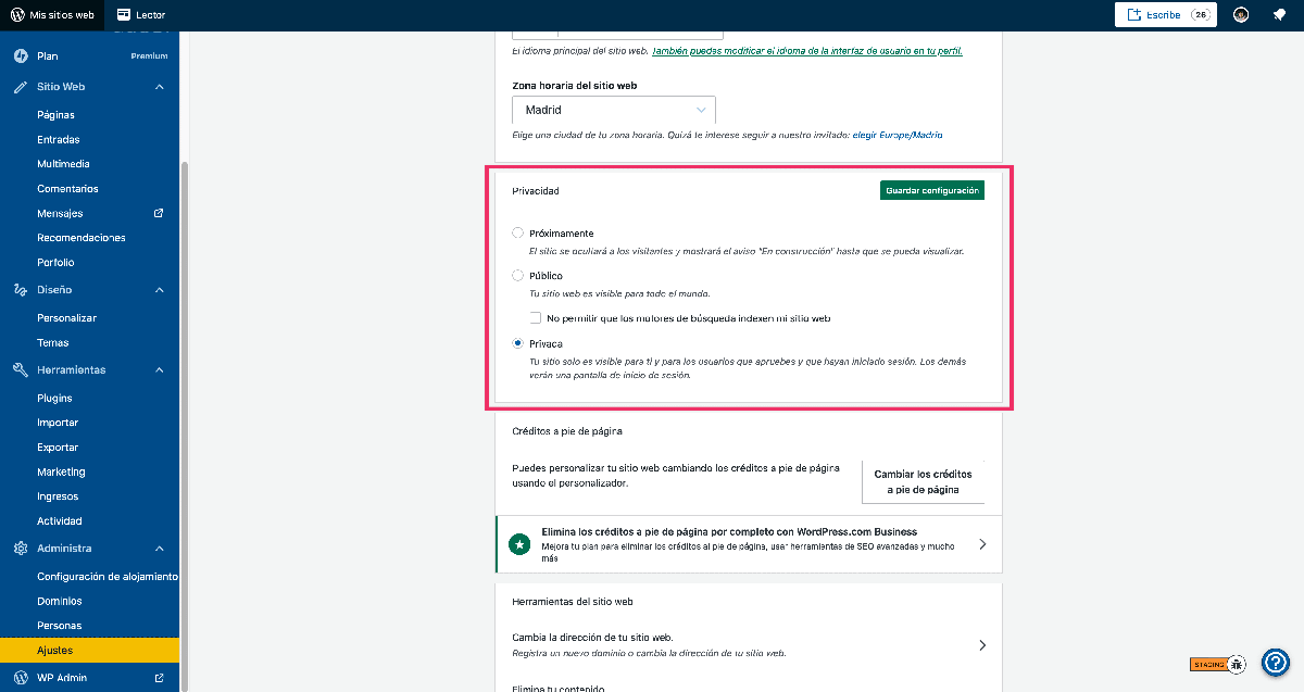 Para hacer que tu sitio sea público de nuevo, ve a Administra en el menu de la izquierda, desde ahí haz clic en Ajustes, baja hasta Privacidad y elige el botón Público. De nuevo, asegúrate de clicar Guardar configuración.