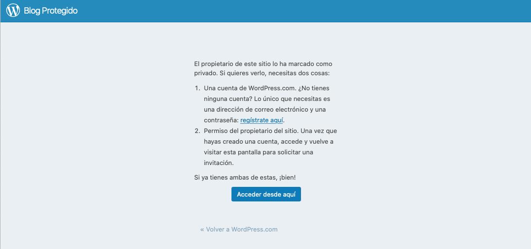 Cuando ese modo está activado, los visitantes verán una página con el título de tu sitio web. Tú y otras personas a las que invites, al estar logueadas con vuestras cuentas de WordPress.com, podréis ver el sitio completo.