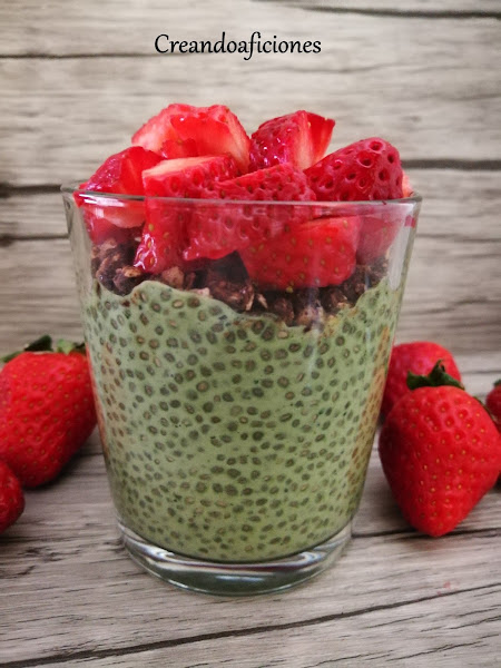 Y si hacemos los de té matcha, ponemos la bebida de almendras, la 1/2 cucharadita de té matcha y removemos hasta que no tenga grumos, echamos las semillas de chía removemos de nuevo y una vez más a los 5 minutos, tapamos con film y guardamos en la nevera.