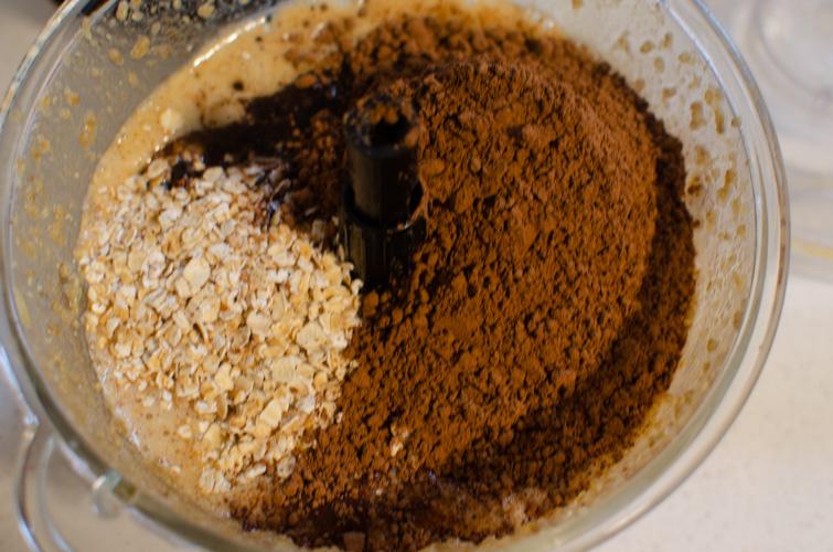 Mezclar la cucharadita de bicarbonato con el vinagre. Agregar el azúcar de coco, stevia, la avena, polvos de hornear, mezcla bicarbonato vinagre y el cacao amargo en polvo. Volver a procesar.