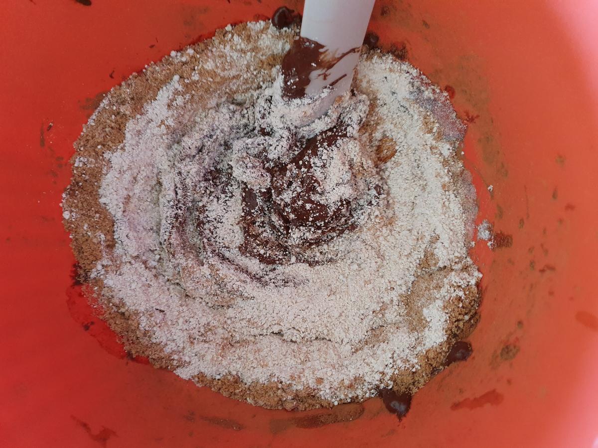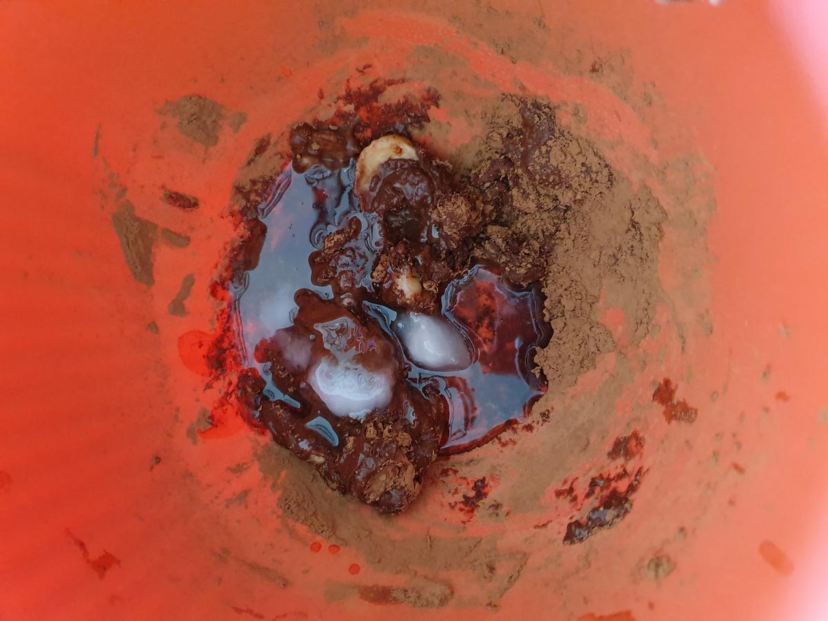 Pre calentar el horno. Moler el plátano con la ayuda de una minipimer. Agregar el aceite de coco derretido y el cacao. Con la misma minipimer mezclar todo bien.