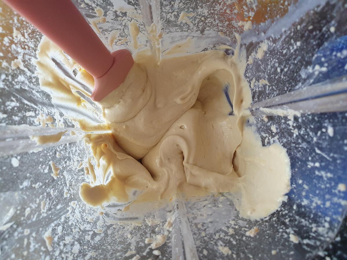 Para lograr esta deliciosa crema, tiene que procesar castañas de cajú con crema de coco y jugo de limón. Idealmente resulta mejor en una licuadora de alta potencia, por que eso permitirá que quede más cremoso el relleno. Si no la tienen, pueden procesar los ingredientes y terminar el proceso con una minipimer para asegurar que no queden grumos y logren un relleno super suave y delicioso.