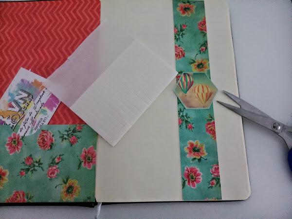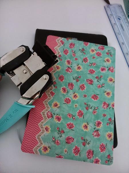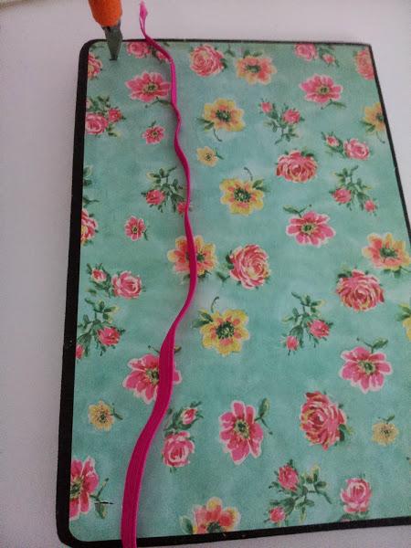 Para la portada utilicé un trozo de otro papel y no le añadí nada más porque, en las fotos no se aprecia pero éste papel lleva purpurina en las flores y no quise recargarla más. Pero resulta que la libreta original venía con una goma de color fucsia y quise utilizarla para cerrarla. Así que debía conservar las marcas que llevaba hechas de fábrica para pasar la goma hacia el interior, Y lo que hice fue hacer un pequeño corte en el papel.