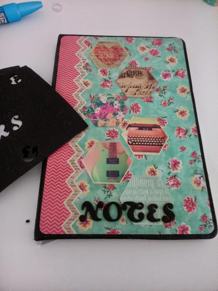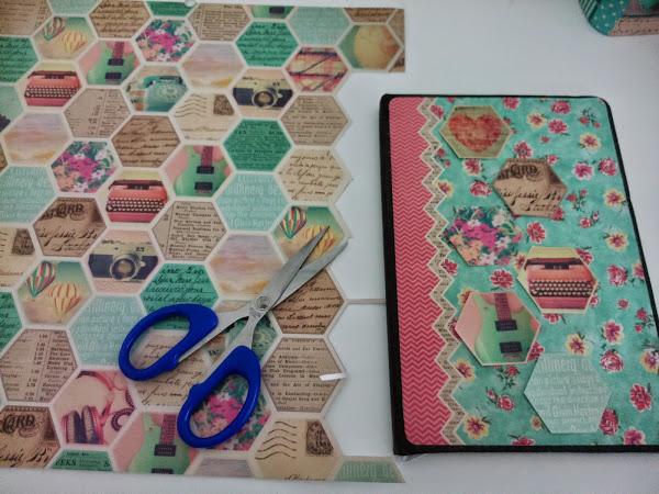 Después recorté unos hexágonos de otro de los papeles; los fui distribuyendo por la portada y de nuevo los pegué con cinta adhesiva doble cara. Os enseño sólo cómo quedó después de engancharlos todos y de ponerle el título a la libreta con unas letras adhesivas de goma eva.