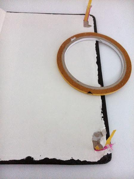 Finalmente entinté los bordes de las páginas con pintura fucsia y ayuda de una esponjita, pero de ésto se me olvidó hacer foto y ahora mismo la libreta está en el escaparate de la chocolatería donde hago mi primera exposición ( podéis verlo en la entrada anterior).