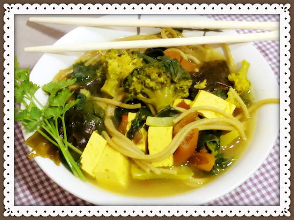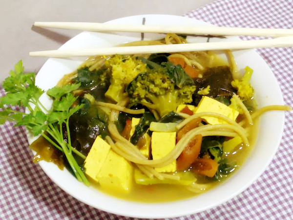 Añade las verduras, el tofu y los espagettis de sarraceno, y las especias.