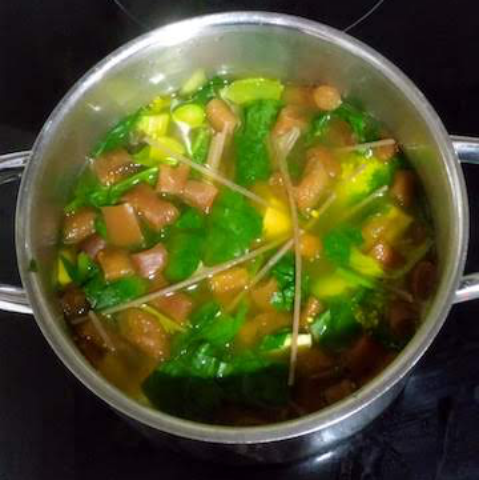 En una olla pon el caldo vegetal con los dos tipos de algas y deja hervir durante 6 minutos.
