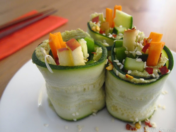 Para hacer los rollitos simplemente unta una cucharada de pesto a lo largo de la Calabaza asegurándote de que llegue hasta los bordes porque esto es lo que lo mantendrá pegado; luego agrega los vegetales y enrolla. Puedes usar semillas de ajonjolí para decorar.