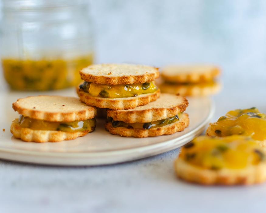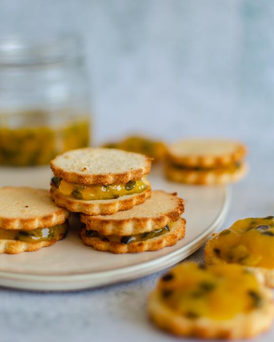 La receta de hoy es de alto impacto!!! Unos deliciosos alfajorcitos rellenos de crema de maracuya. Uf! Sin palabras lo deliciosos y refrescantes que quedan.