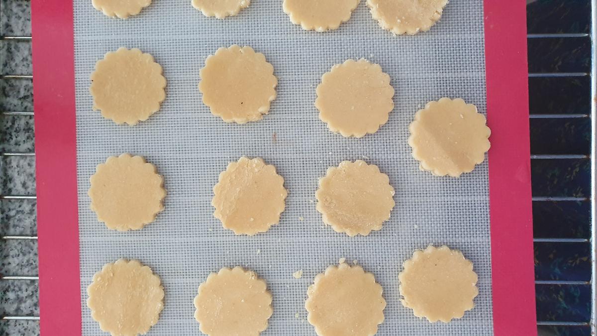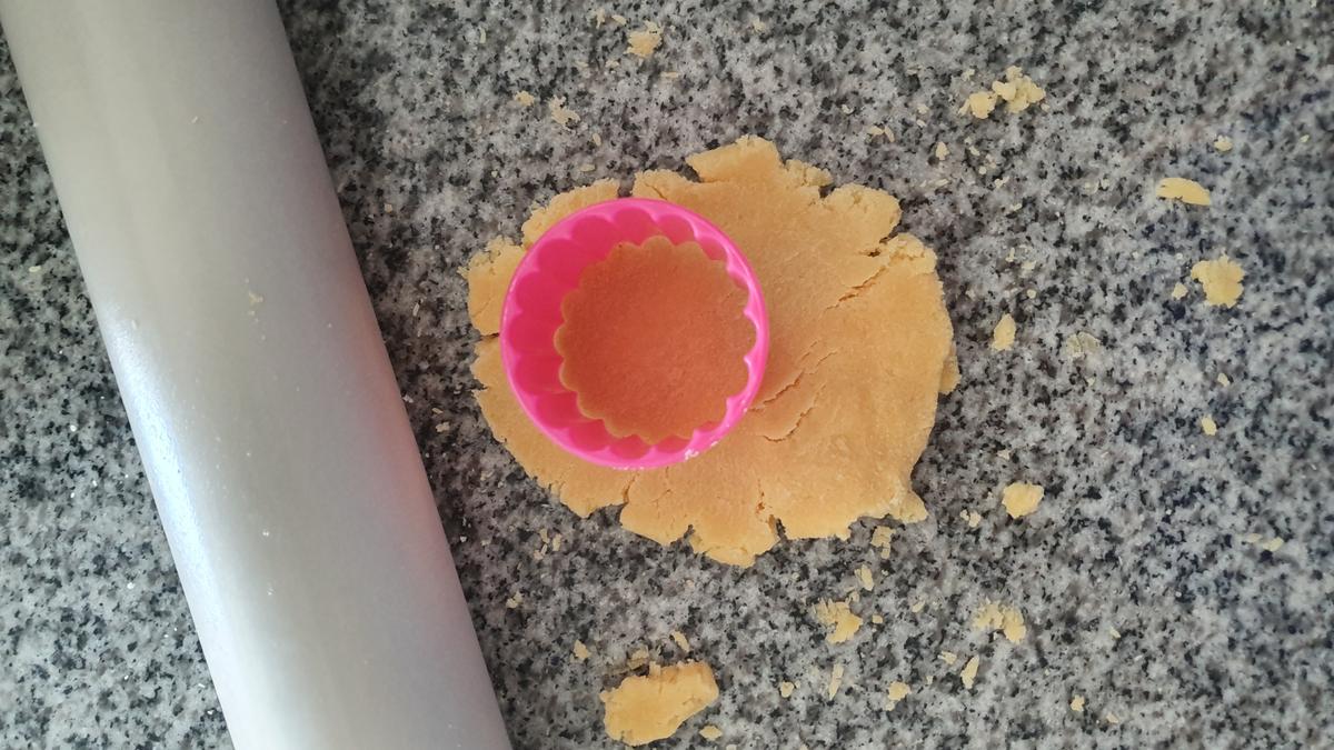 Pasado este tiempo volver amasar la masa, esparcir harina sobre un mesón limpio y uslerear (aplanar). Poner el molde que vayan a usar e ir armando cada galleta. Si usan solo harina de coco, aplanar usando un papel plástico o de mantequilla para que la masa no se rompa.