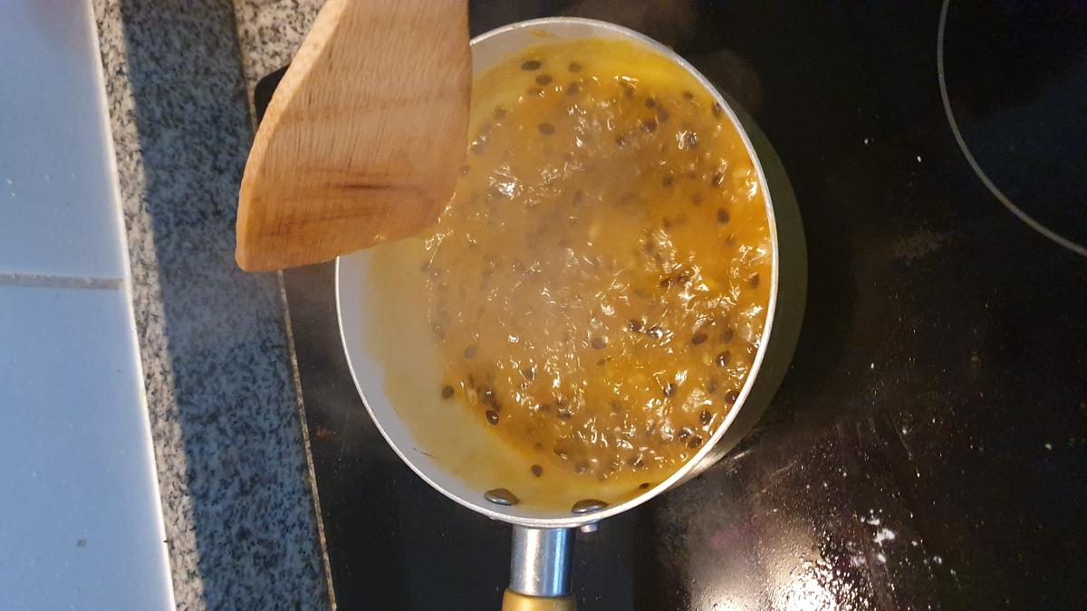 Para el relleno, poner la pulpa de maracuya, jugo de limón y el endulzante en una olla. Diluir la maizena en dos cucharaditas de agua fría y agregar a la olla. Revolver a fuego medio y esperar que hierva, seguir revolviendo por 2 minutos, hasta que espese y sacar del fuego. Esperar a que se enfríe.