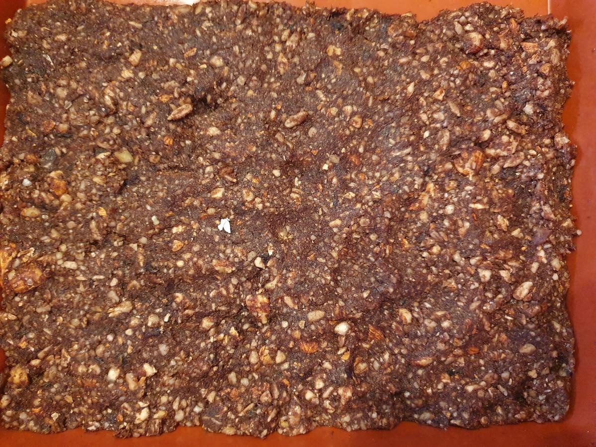 Agregar los Dátiles remojados con las almendras, nueces, semillas y cacao en la procesadora. Procesar hasta lograr una pasta. Esparcir esta pasta en un molde de silicona y reservar.