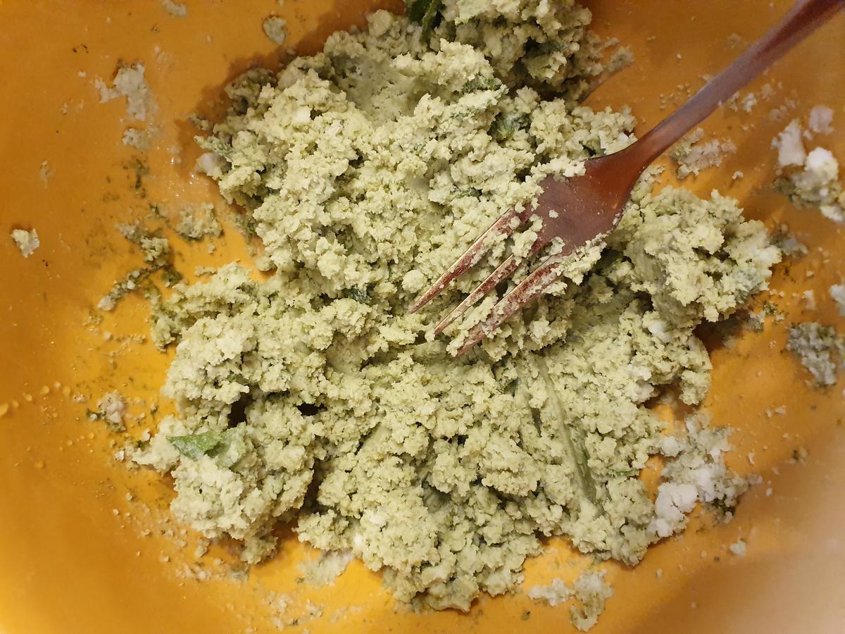 Para la segunda capa agregar el coco rallado y la crema de coco a la licuadora o procesadora. Licuar hasta lograr una especie de mantequilla o pasta. Agregar la stevia, hojas de menta picadas, esencia y el té matcha. Mezclar bien.