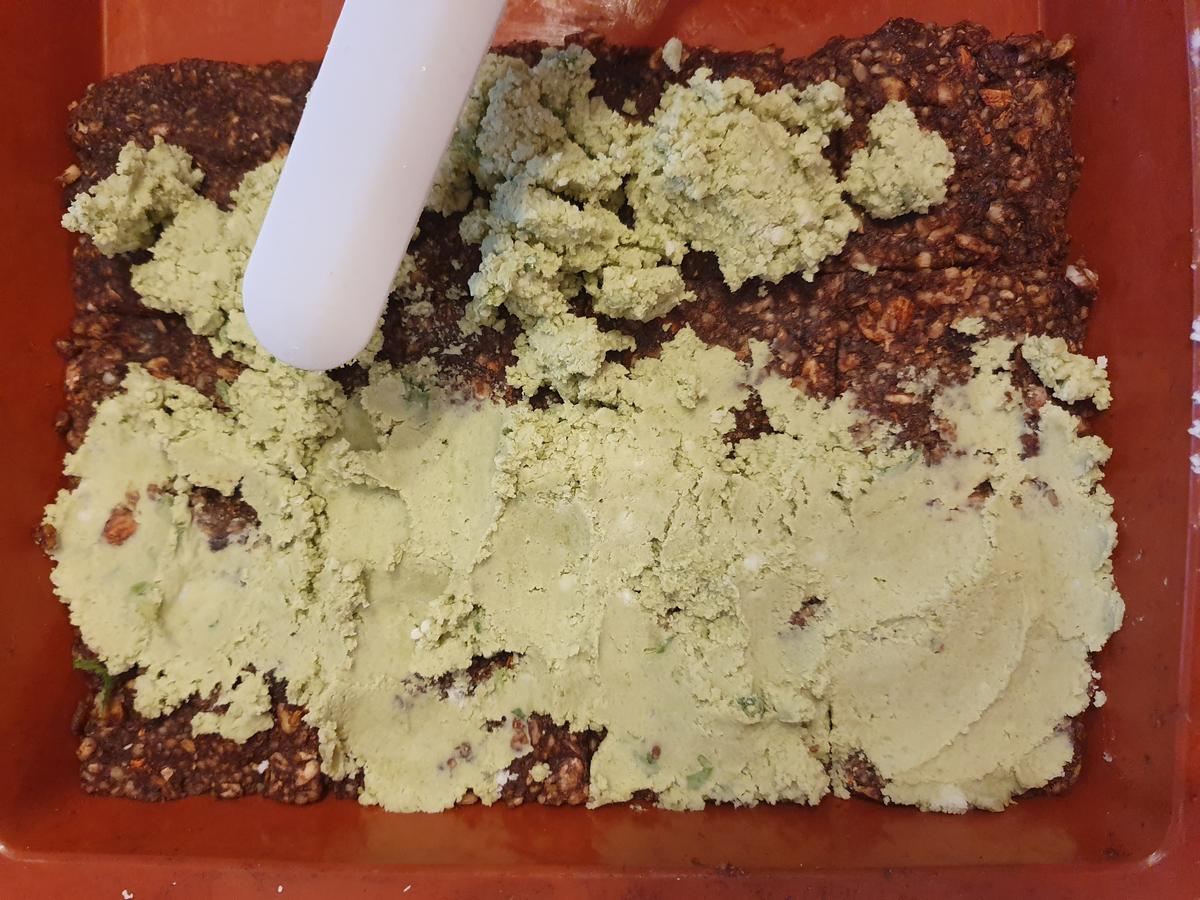 Esparcir la pasta de coco sobre la primera capa. Pre cortar la barras y refrigerar.