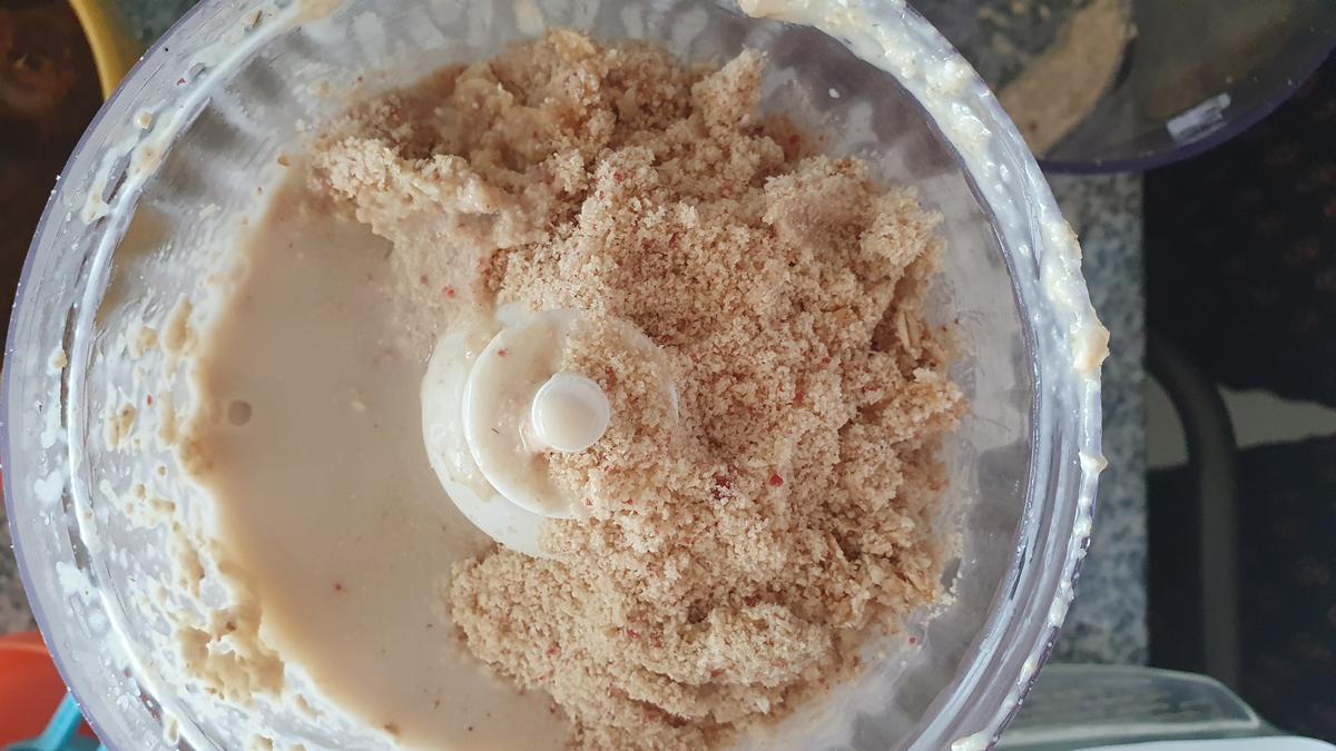 Agregar los dátiles remojados y la mantequilla de maní en la procesadora o licuadora. Procesar hasta lograr una pasta.