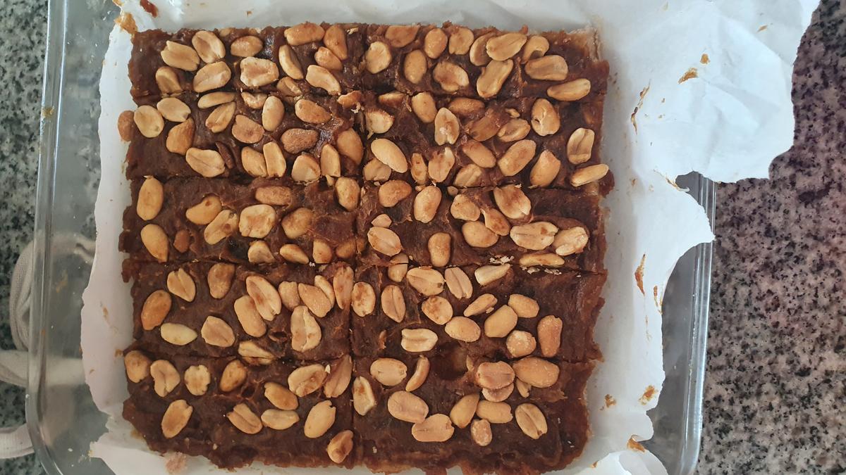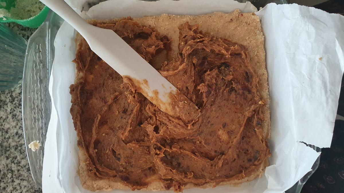Esparcir la segunda capa sobre la primera. Una vez esparcida agregar el maní natural sobre la pasta de dátiles. Pre cortar las barritas y regriferar por 1 hora
