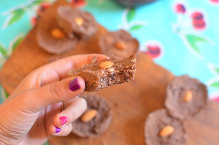 Remojar los dátiles 10 minutos en agua caliente. Luego agregarlos a la procesadora junto con las almendras, coco rallado y 2 cucharadas de cacao amargo.