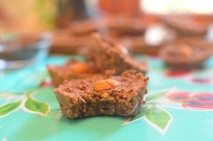 En un molde para cupcakes o muffins, agregar una cucharadita de la pasta de dátiles en cada molde. Esparcir bien y poner en el congelador mientras hacen la segunda parte.