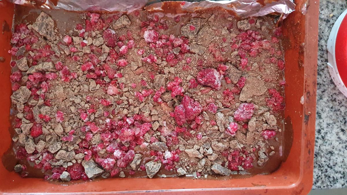 Traspasar a un molde idealmente de silicona, previamente aceitado. Esparcir las frambuesas congeladas y el chocolate picado sobre la mezcla en el molde.