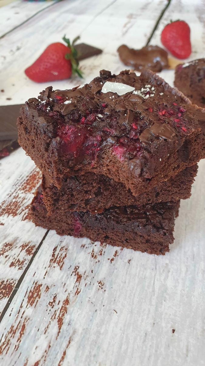 Para mi toque final agregue chocolate 80% cacao sin azúcar añadida y frambuesas congeladas! Una mezcla que corono a la perfección estos brownies.