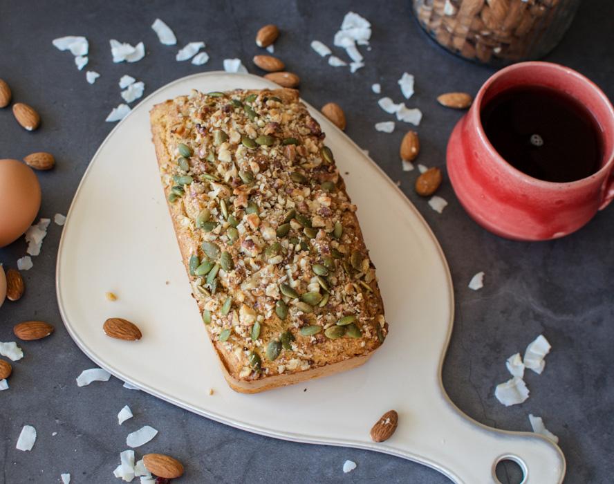 Volviendo a este pan, es un receta deliciosa y muy fácil de preparar!! Es a base de harina de almendras (almendras molidas) y de coco. Junto con aceite de oliva, huevos y semillas. Ni se imaginan lo rico!! Es fácil de preparar y una vez listo no se desarma y se puede cortar fácilmente.