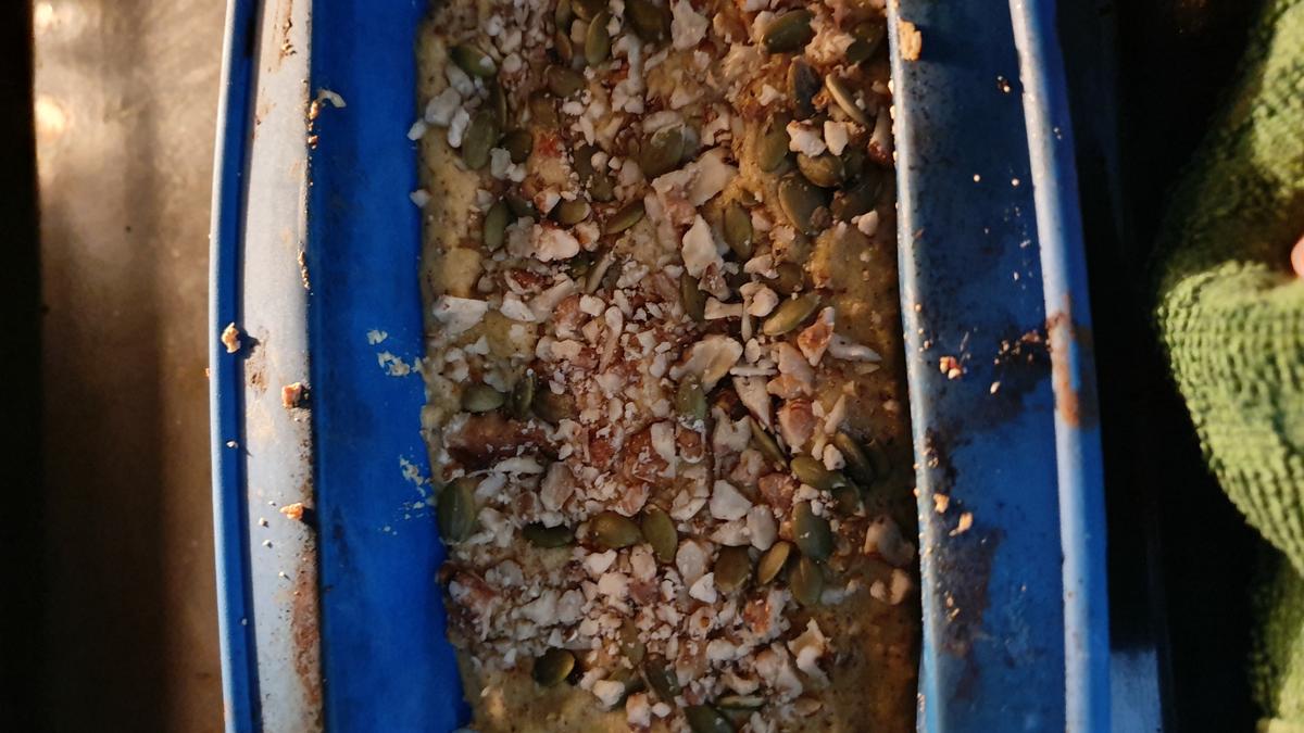 Esparcir la mezcla en el molde que vayan a usar. Idealmente usar de silicona y previamente aceitado. Esparcir las semillas y nueces picadas sobre la mezcla.