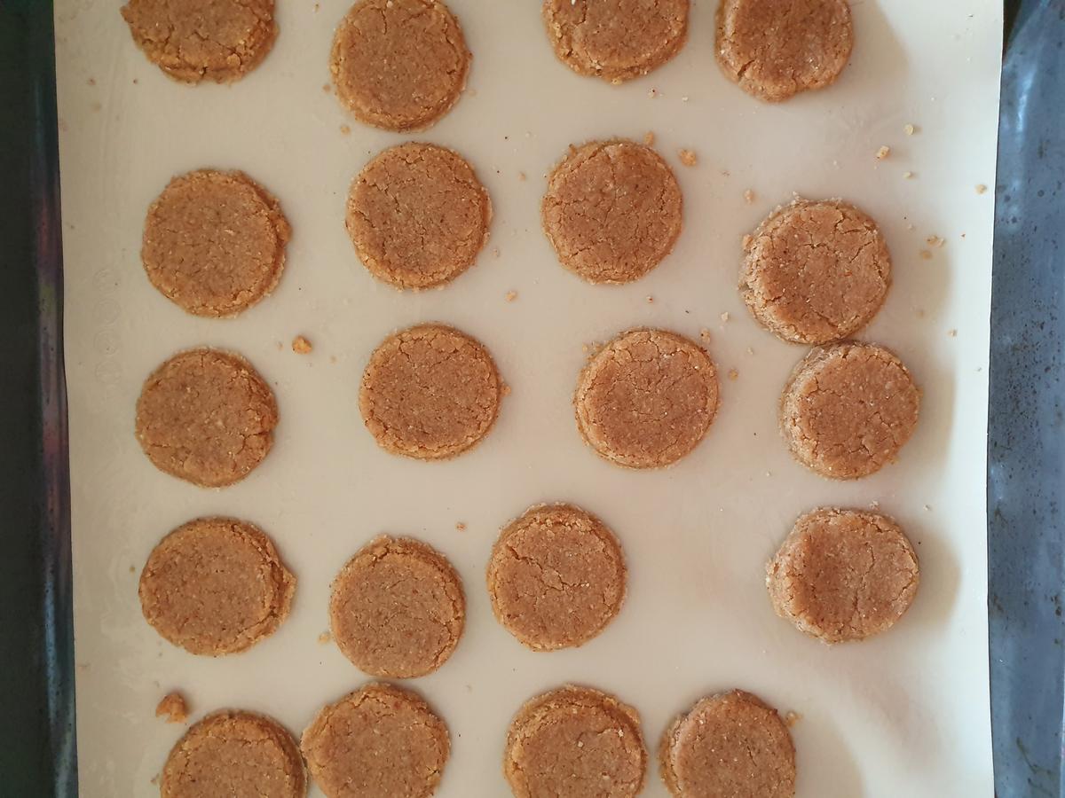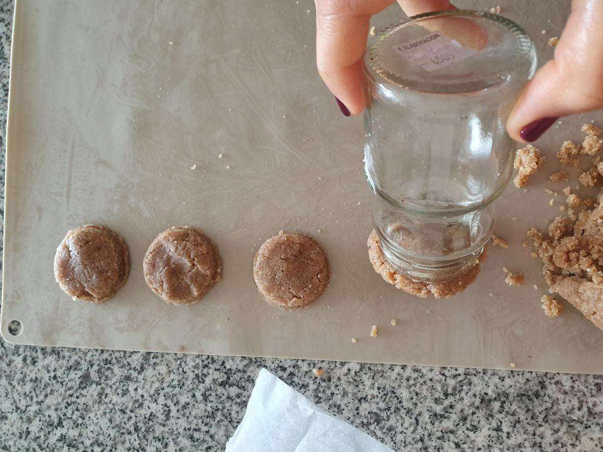 Pre calentar el horno. Pasado los 30 minutos comenzar armar cada galleta. Armar bolitas, aplanar e idealmente darle forma con un molde (yo utilicé un frasco con boca mediana). Pueden finalizar la forma, aplanando ligeramente cada galleta con un uslero.