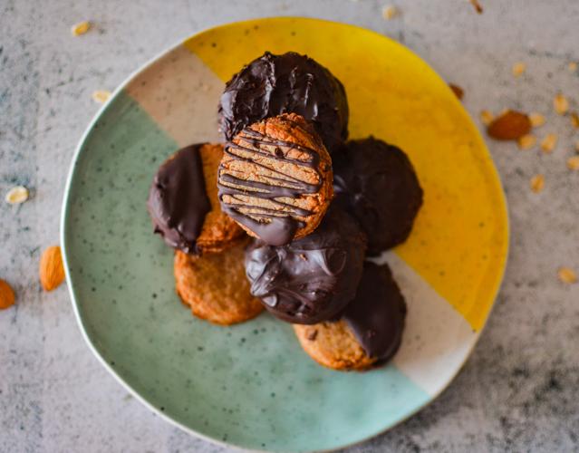 Otra opción es solo preparar las galletas y no hacerlo como alfajores, ya que, definitivamente creo que estas galletas son las más ricas que he preparado hasta ahora. Para lograr esta masa perfecta necesitan almendras y avena. Una mezcla que no solo muy rica, si no también muy saludable. Logramos una buena mezcla de nutrientes.