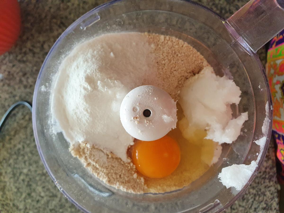 Agregar el huevo, aceite de coco, azúcar o endulzante que vayan a usar y las gotitas de stevia.