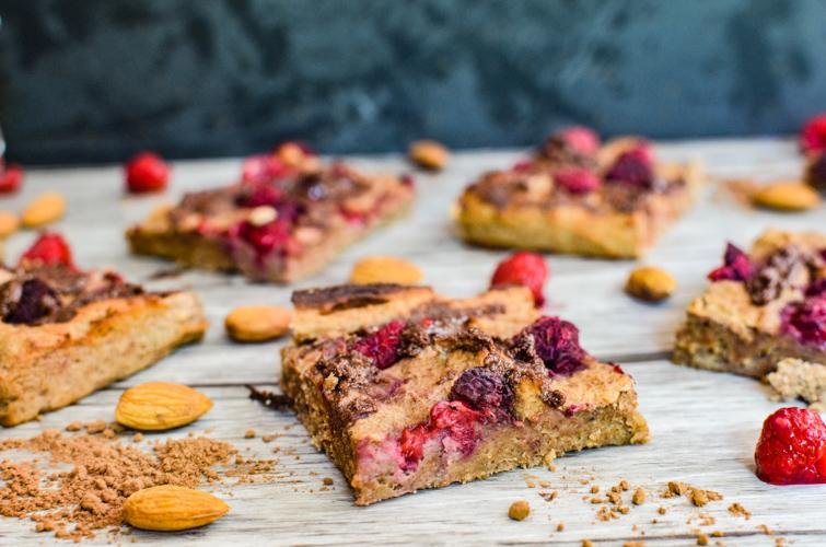 Opcional: Mezclar las dos cucharaditas de mantequilla de maní o almendras con cacao amargo y agregar sobre cada blondie