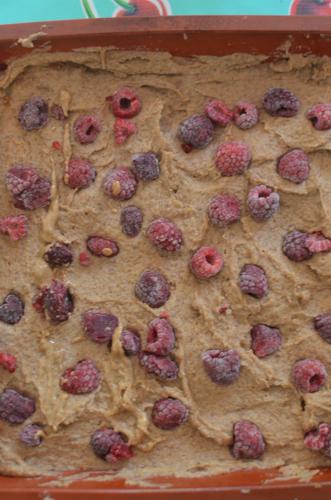 Esparcir una cucharadita de aceite en el molde (ideal rectangular o cuadrado) que van a usar. Agregar la masa y esparcir bien. Agregar las frambuesas sobre la masa.